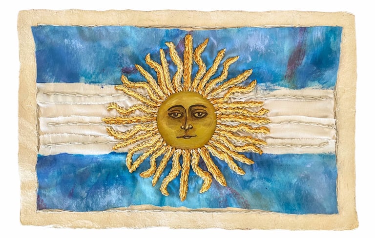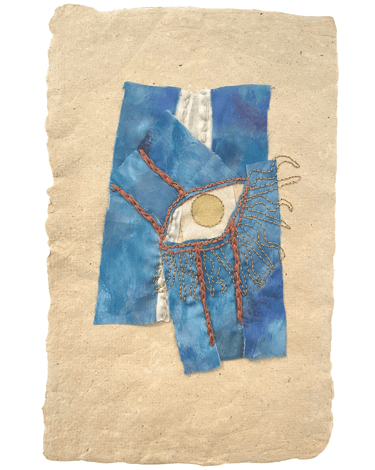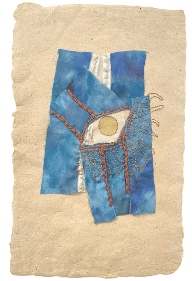 Technique : Huile sur satin, encre de Chine, gouache dorée, broderie aux fils dorés sur papier artisanal de Colombie.