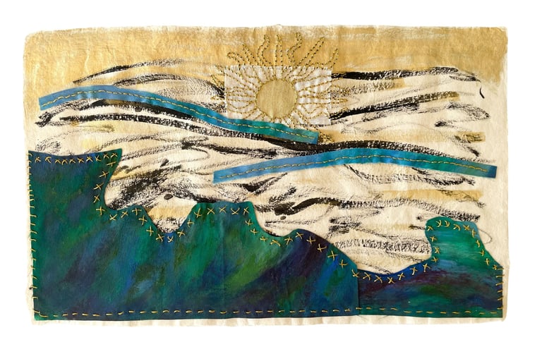 Technique : Huile sur satin, encre de Chine, gouache dorée, broderie aux fils dorés sur papier artisanal de Colombie.